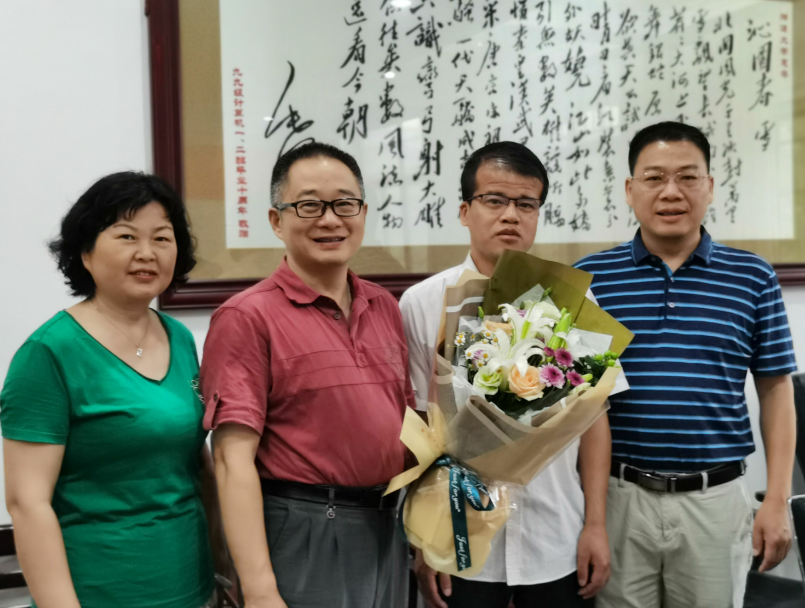 在电气工程学位点中期检查现场,金义华为优秀党员资深学者段斌同志献上鲜花,对他多年来为学院的辛勤付出表示衷心感谢。段斌同志不仅科研上卓有成就,而且一直致力于课程思政的教育教学,被大家赞誉为集理工科的严谨与文科的优美于一身;作为院长期间,一直谋划和指导学院进行专业建设,三个专业成为国家级一流专业建设点。最后,大家一起合影留念。