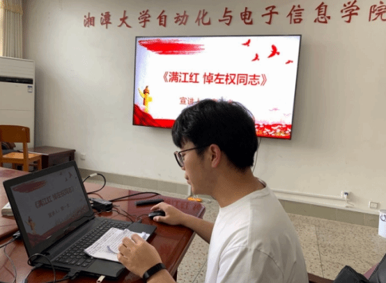 会议邀请本科生第一党支部党员分享红色革命诗词。2018级学生窦一龙、成思霖先后分享诗词《满江红•悼左权同志》《七律•百团大战》,他们采取文字讲述、视频播放、现场朗诵等丰富多彩的方式,对诗歌进行了赏析讲解,引导大家深入了解作者情况、创作时代背景、关键历史事件、著名历史人物以及现实启示意义等,立体、形象、生动地展现了抗日战争期间中国人民奋勇抗战流血牺牲的悲壮场面,在场党员深刻感受到了共产党人天下兴亡、匹夫有责的爱国情怀,视死如归、宁死不屈的民族气节,不畏强暴、血战到底的英雄气概,百折不挠、坚忍不拔的必胜信念。