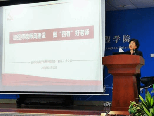 报告中,首先组织学习了湘大党发【2021】22号文件“关于认真学习贯彻习近平总书记给全国高校黄大年式教师团队代表重要回信精神的通知”,然后以播放视频形式让大家了解了黄大年同志的生平事迹,并结合湘大纪发【2021】4号文件“关于进一步加强‘四风’问题常态化整治的通知”的精神,请全体教职工监督领导干部反对“四风”,抓好作风建设。金义华还列举了常见的师德失范的典型情形,结合本院教工中某些不良现象,强调全体教职工加强师德师风建设的重要性,要求大家以黄大年同志为榜样,立足本职岗位,争做有理想信念、有道德情操、有扎实学识、有仁爱之心的“四有”好老师。