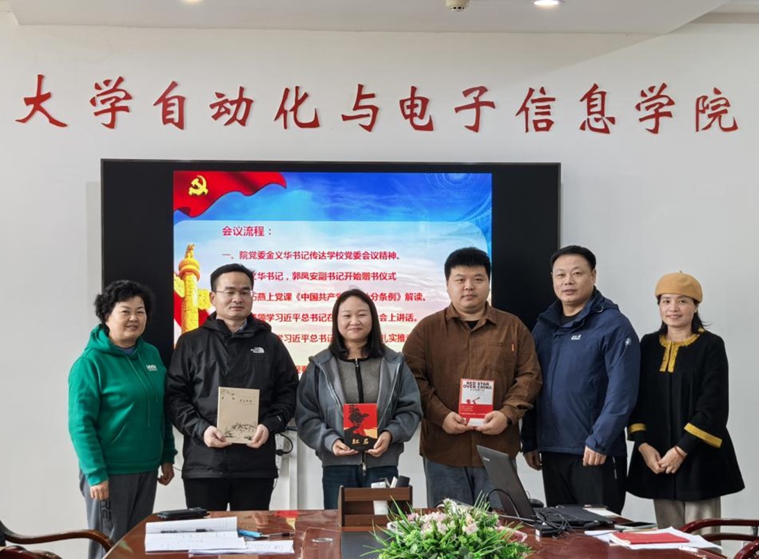 会议第二项,进行了“赠书仪式”,院党委书记金义华、院党委副书记郭凤安对即将转出的刘燕、吴政宏、陈洋卓3名支部成员赠送《红岩》、《红星照耀中国》、《乡土中国》的红色书籍,对他们在支部中做出的工作表示感谢和肯定,并希望3名党员同志在担任研究生支部书记同时,讲好中国故事、传播好中国声音,展现可信、可爱、可敬的中国形象,增强中华文明传播力影响力。