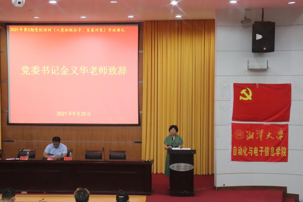 随后,金义华书记致辞。她首先对参加本期党校培训的全体学员表示欢迎和祝贺,同时指出学院党委高度重视学生党员发展工作,通过引用习近平总书记的“青年兴则国家兴,青年强则国家强,青年一代有理想、有本领、有担当,国家就有前途,民族就有希望”,强调注重培养和造就具有坚定共产主义信念、品学兼优的优秀积极分子,并吸纳到党组织中。希望同学们能珍惜本次培训学习机会,做到以端正的态度对待本次培训,深入学习和理解党的知识,做到理论联系实际,发挥模范作用。