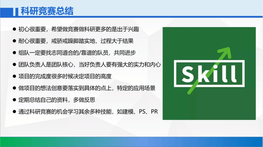 以赛促学,拓宽视野。通过参加专业竞赛,进一步巩固自身的专业知识、提高专业技能,拓展自己的视野。在此建议大家尽早加入实验室参加竞赛,提升自己综合竞争能力。推荐学科竞赛如:数学建模(国赛、美赛)、大英赛;专业竞赛如:智能车竞赛、电赛、西门子杯、工程训练大赛;创新比赛如:互联网+、挑战杯等等。有竞赛需求的同学可以了解相关比赛内容与要求。