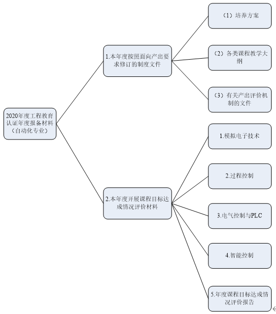 2.本年度按照面向产出评价机制的要求,开展课程目标达成情况评价的有关材料。仅需报备当年度评价课程(在一个评价周期内覆盖所有课程即可),本年度评价课程为模拟电子技术、过程控制系统、电气控制与PLC、智能控制,每门课程一个文件包,包括:
