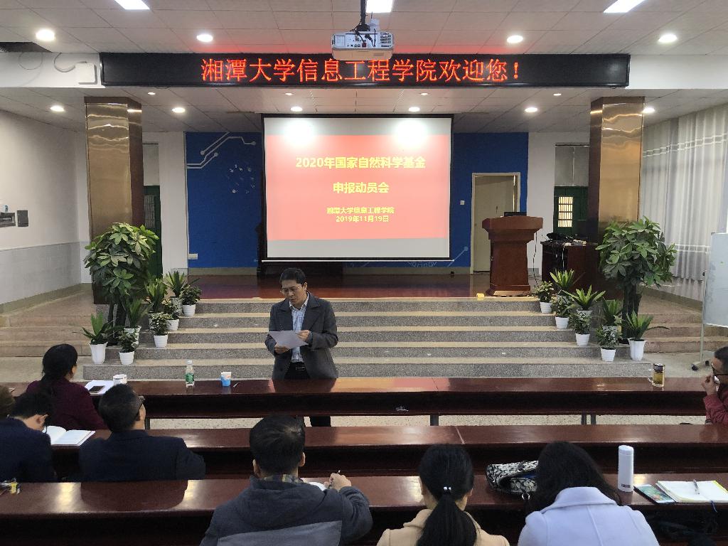 (通讯员:张秋菊)2019年11月19日下午,信息工程学院在工科北楼阶梯教室召开了2020年国家自然科学基金申报动员会。会议由信息工程学院科研副院长欧阳建权主持,学院领导及全体教师参加了此次会议。欧阳建权副院长对2020年国家自然科学基金申报动员作了详细的报告。