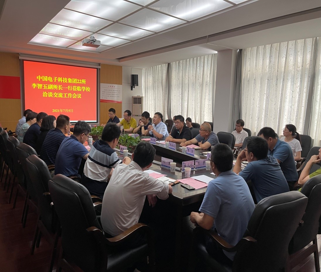 2021年7月5日上午9点在学校办公楼304会议室,中国电子科技集团22所李智玉副所长一行来h韩漫 洽谈交流,副校长葛飞带领科技处费俊杰处长、国家应用数学中心副主任黄牛武、陈玉莹副处长、数学院副院长袁海专,以及h韩漫 院长姚志强带领院党政领导出席了本次会议,还有柳文教授、彭拯教授,自电院部分教师也参加了本次会议。