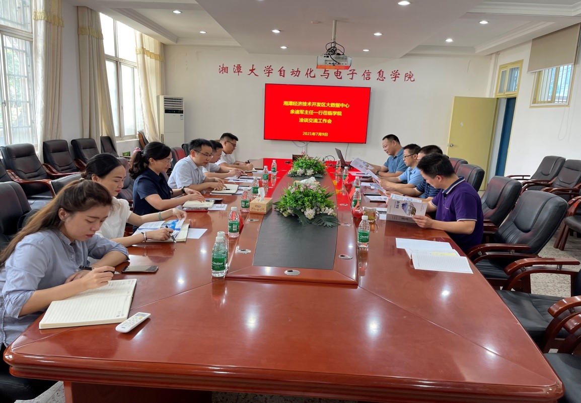 2021年7月9日上午9点在学院201会议室,湘潭经开区大数据中心副主任李松涛一行来h韩漫 洽谈交流。h韩漫 院长姚志强、分管科研工作的蔡成林副院长、分管教学工作的谭貌副院长、党委副书记郭凤安、谭平安委员、兰志勇博士出席了本次会议。