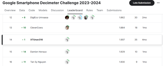参赛队伍“XTUnav316”在大赛中取得了优异成绩!团队成员包括“智能可信导航与定位”湖南省重点实验室博士研究生刘胜(队长),2023级硕士研究生陈志鹏,以及2022级自动化专业本科生陶晓宇与王康伟,是一支由本硕博学生联合组成的队伍,由重点实验室主任姚志强教授指导。经过十个月的努力,“XTUnav316”队伍对官方数据集进行了深入分析,建立了数学模型,并不断优化算法以提高定位精度。最终,他们在全球280支参赛队伍中排名第14,跻身全球前5%。