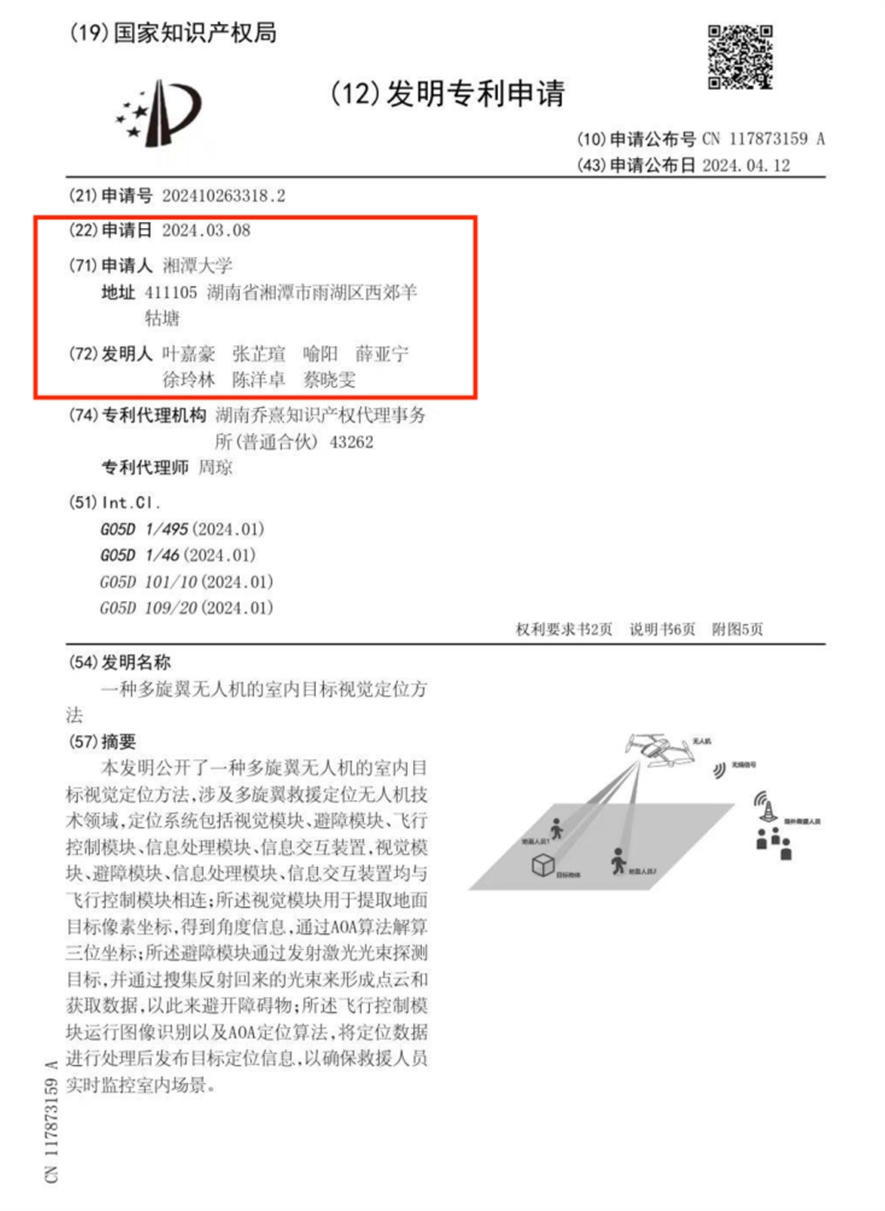 4月12日,由21级通信工程专业叶嘉豪同学为第一发明人的发明专利“一种多旋翼无人机的室内目标视觉定位方法”通过快速预审通道获得授权,用时仅35天。