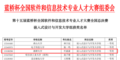 第十五届蓝桥杯全国软件和信息技术专业人才大赛中,TI创新实验室获省级一等奖2项、省级二等奖7项、省级三等奖10项,其中叶嘉豪同学过五关斩六将,在嵌入式设计与开发大学组总决赛中获全国一等奖。
