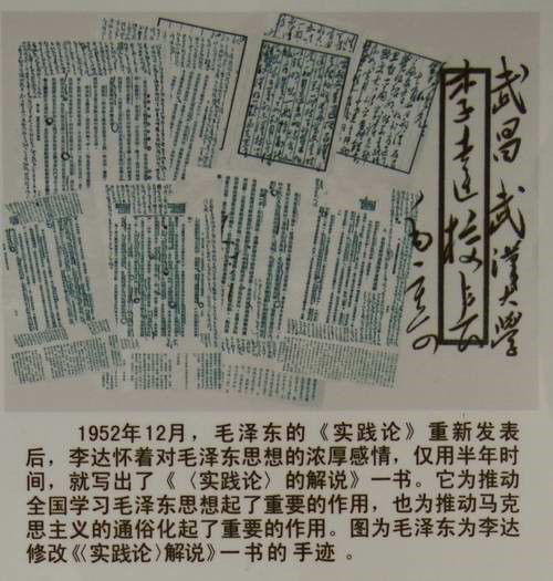 实事求是,真知灼见。李达致力于理论的研究,被毛泽东同志称赞为“理论界的鲁迅”。他撰写了“两论”辅导读本——《<实践论>解说》和《<矛盾论>解说》,《〈实践论〉解说》中他对真理的检验标准的表述为:“真理的标准,只能是社会实践,此外别无标准。”《〈矛盾论〉解说》讲到社会主义社会的矛盾问题时他指出:“在社会主义社会中,‘矛盾还是存在着’,并且‘仍是社会发展的动力’,但这种矛盾主要是非对抗性的矛盾,解决社会主义社会中生产力和生产关系的矛盾,‘必须不断地发展生产力’,在高度技术基础上使社会生产力不断增长和完善。”从李达同志的这些理论中,可以看出李达同志秉持着实事求是的态度,对马克思主义理论、毛泽东思想有着深入的学习和研究,并对毛泽东思想的宣传和普及,以及马克思主义的时代化、大众化作出了重要贡献,理论闪烁着真知灼见。