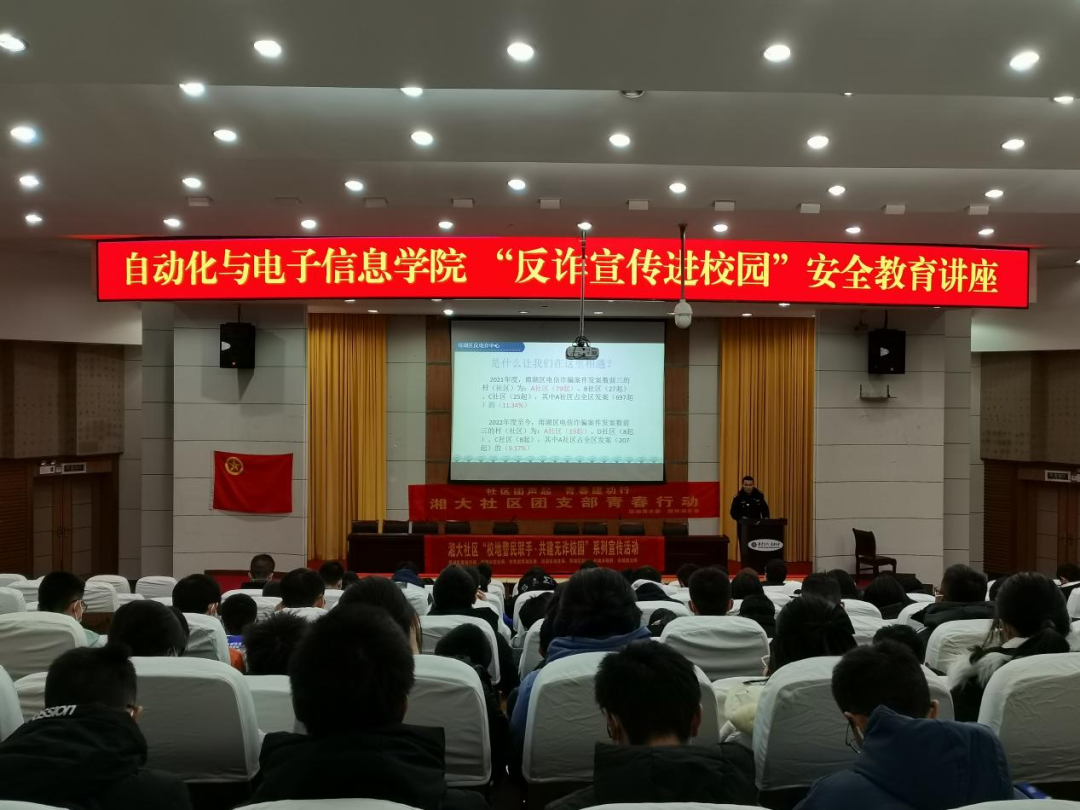 携手湘大社区、雨湖区反电诈中心,开展“反诈宣传进校园 ,共筑安全防护墙”新生安全教育讲座。新生辅导员蒋昱梅老师与百余名学生参与了本次活动。