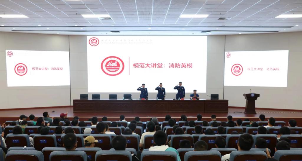 模范大讲堂开讲,本期联合湘潭市消防救援支队。“韶山卫士” 韶山市消防救援大队,“湖南省抗击新冠肺炎疫情先进个人”彭诗凯,“全国消防救援队伍优秀女干部”彭娟为现场600余名本科生讲述消防救援事迹。