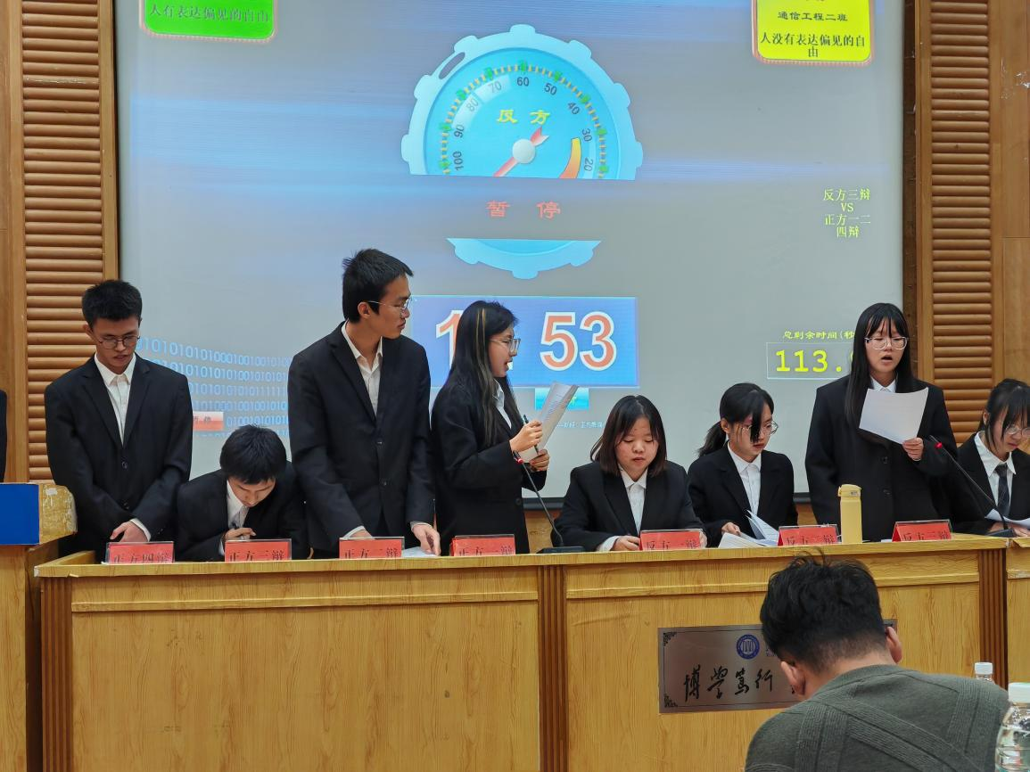 在比赛开始前,学院辩论队以“生活的暴击值不值得感激”为话题带来了精彩的表演赛,顿时将现场气氛推向高潮。随后,决赛正式拉开帷幕。双方围绕“人是否有表达偏见的自由”为题展开了激烈的辩论。选手们言辞犀利、思维敏捷,比赛过程精彩纷呈,观众席掌声不断。