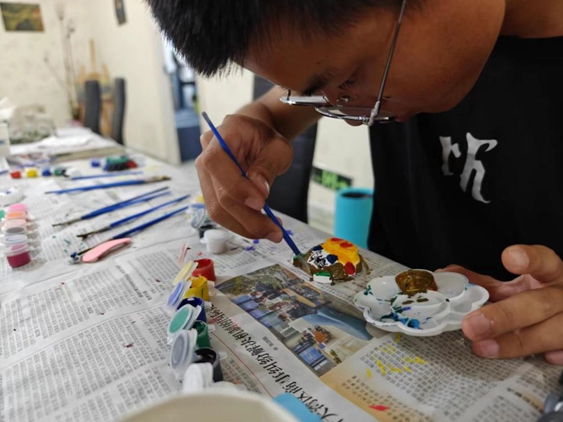 走上二楼,一番更加不一样的光景可以得见:手工制作,拿着白色的模板,尽情的将自己脑海中的想法用手头的笔触挥洒在石膏底色上。也有用毛绒绒的丝线制作各种小物件的同学,是花,是小狗,是一副眼镜,同学们也一起合作,共同完成一件件作品,捧在手中,无不体现了人工智能1班的“团结有力量”的外在。
