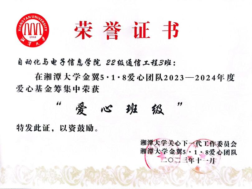 金翼5·1·8爱心团队于2023—2024年度爱心基金筹集活动中,因卓越表现荣获“爱心班级”称号。