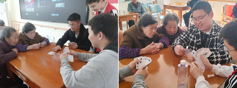 除了聊天,同学们还与老人们一起玩了扑克牌和益智游戏。在牌桌上,老人们不仅思维敏捷,出牌果断,还充当起同学们的“军师”,为他们出谋划策。同学们表示:“在玩耍的过程中,爷爷奶奶们就像同龄人一般,这对于我们来说是从未有过的体验。”