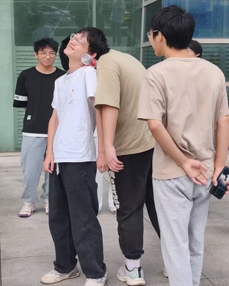 在“传递空水瓶”的环节,同学们紧密团结,围成一圈,采用脖子夹紧空瓶的方式,依次传递给旁边的同学。尽管过程中空瓶不时掉落,考验着同学们的耐心和协作,但他们依然默契配合,最终成功完成了水瓶的传递任务,充分展现了团队间的协作精神和坚韧意志。