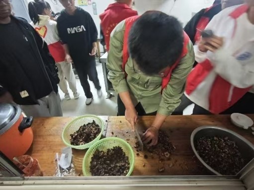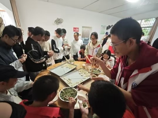 在包饺子环节,厨房里热闹非凡,同学们围坐在一起,共同体验着传统美食的制作过程。揉面、擀皮、调馅、包饺子,每一步都充满了乐趣与温馨。大家一边忙碌着手中的活计,一边欢声笑语地交谈着,分享着彼此的生活点滴。不一会儿,一个个形状各异的饺子便摆满了托盘,有像月牙的,有像元宝的,充满了生活的气息。整个场面洋溢着浓浓的“亲情”和家的温暖,让老人们感受到了来自社会的关爱与温暖。