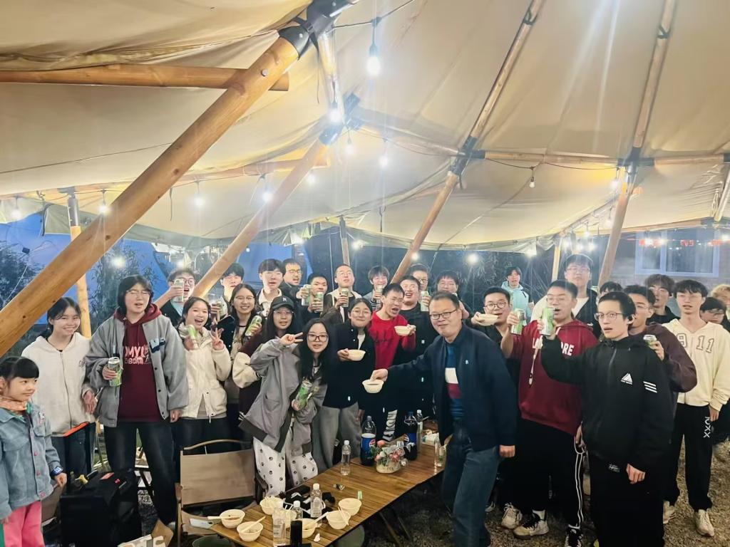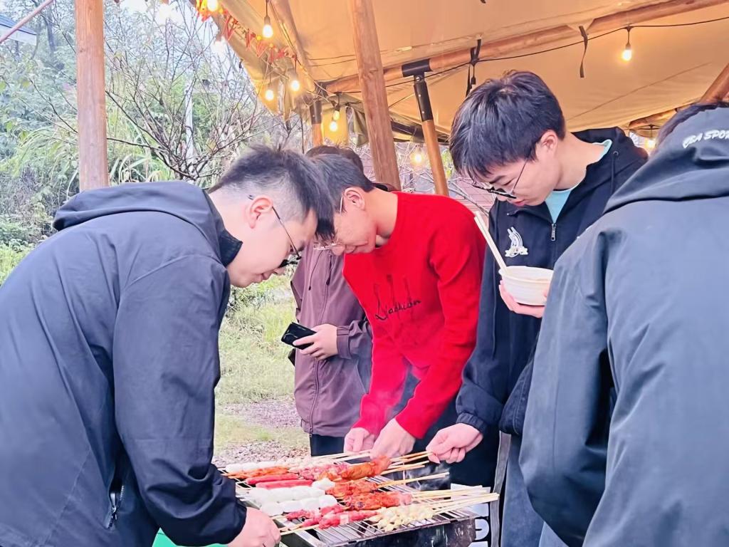 随着暮色渐浓,云层逐渐厚重,同学们开始动手准备晚餐。就在大家架炉烧烤时,天空下起了绵绵细雨。然而,这并没有影响同学们的热情。他们分工明确,各司其职,享受着团队合作的乐趣。还有同学为大家激情献唱,将团建活动的气氛推向了高潮。在音乐的环绕下,大家忘却了烦恼,心中只有无尽的热情和欢乐。