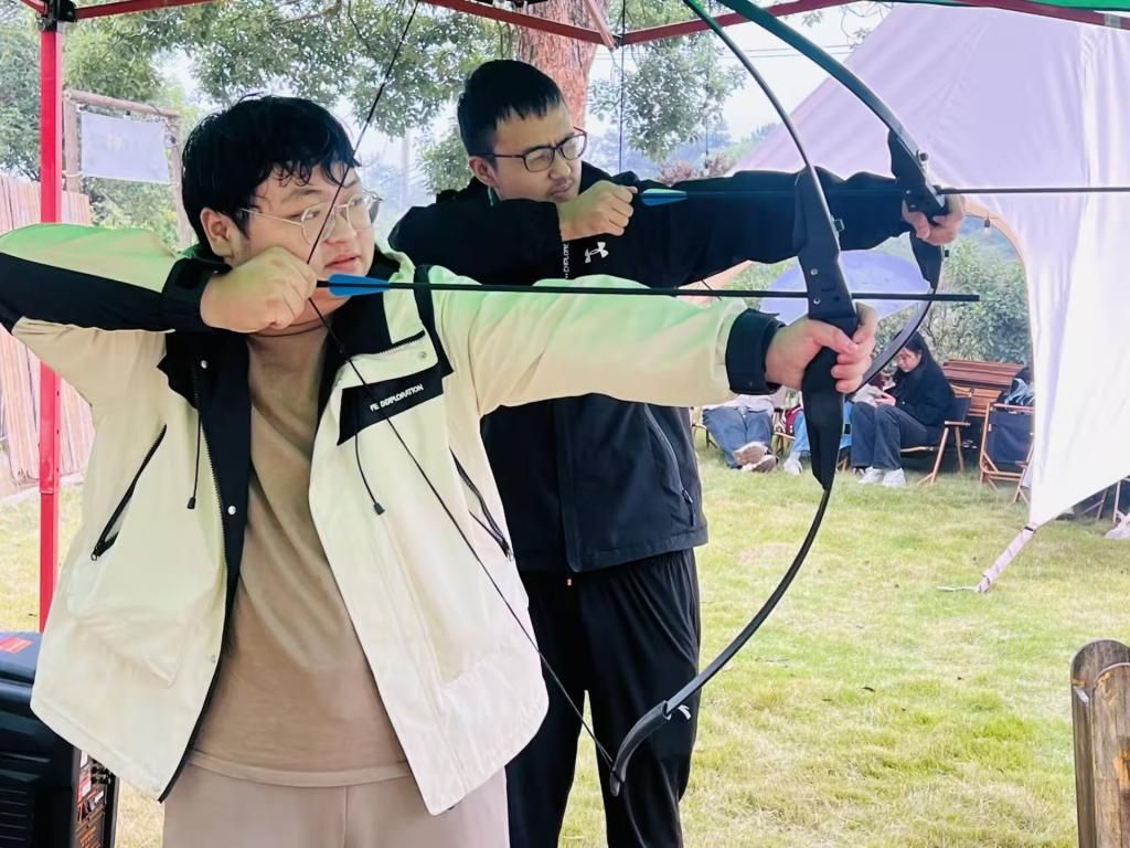 活动的第一项是射箭。同学们兴致勃勃地来到射箭场上,想要一展身手。有人遗憾脱靶,亦有人正中靶心。在同学们的阵阵欢笑中,他们结束了比赛。纵使比赛有输有赢,同学们依旧兴致盎然。
