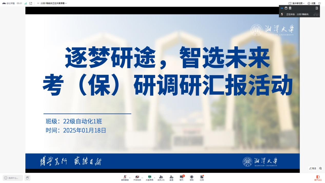 此次 “逐梦研途,智选未来” 考研保研调研活动取得了圆满成功。它为 2022 级自动化一班的同学们搭建了一个获取考研与就业信息、交流经验的优质平台,相信在这些信息的助力下,同学们在未来的考研保研以及就业之路上将能做出更明智的选择,朝着自己的梦想稳步迈进。后续,班级也将持续关注同学们的升学和就业需求,组织更多有益的活动。