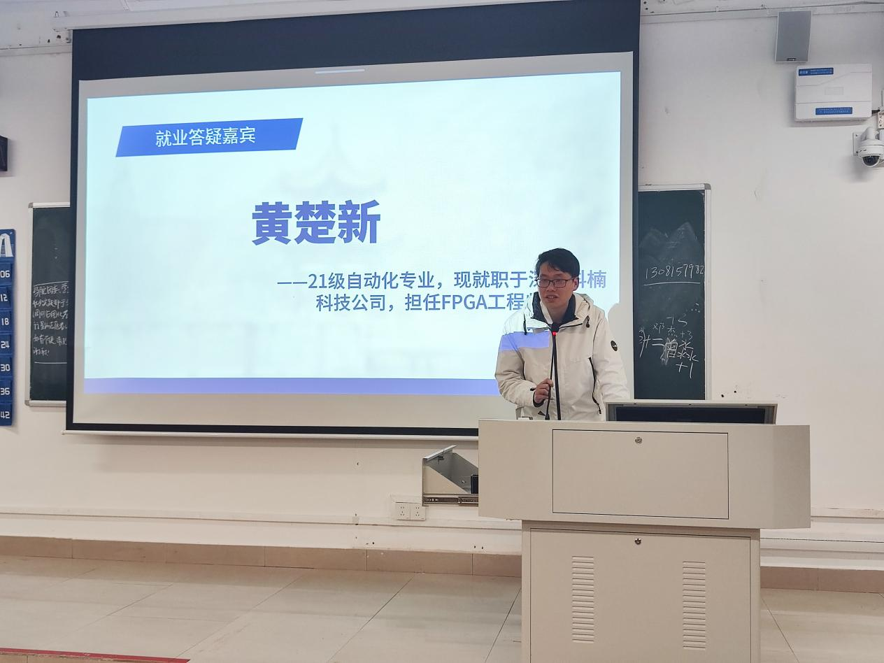 随后,黄楚新学长上台分享。黄学长是21级自动化专业学生,现就职于深圳科楠科技公司,担任FPGA工程师。他结合自身就业经历,指出专业技能的学习非常重要。黄学长建议选择就业的同学们尽早确定一个自己相对感兴趣的方向进行深度学习,不仅要掌握书本上的知识,还要通过实践来提升自己的实际操作能力。黄学长还分享了简历填写的技巧,建议同学们在简历中突出自身学习实践、企业相关的项目经历、证书、竞赛成果。他提醒同学们在简历投递过程中,可以选择只招收应届生的企业以及校招企业,提高投递成功率。此外,黄学长还强调了实习的重要性,指出实习不仅可以帮助同学们积累实践经验,还可以为未来的就业打下坚实的基础。