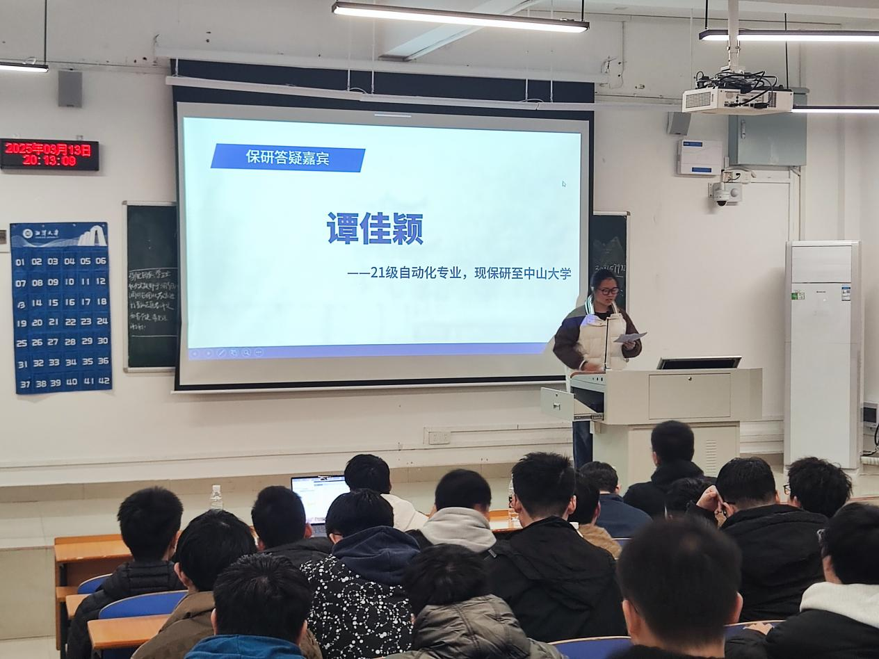 接下来,谭佳颖学姐上台发言。谭学姐是21级自动化专业学生,现保研至中山大学。她详细分享了保研的各个流程,包括前期简历的准备、夏令营和预推免的申请、参加复试与面试等。谭学姐指出,保研是一个竞争激烈的过程,需要提前做好充分的准备。她强调了英语自我介绍的重要性,建议同学们提前准备并反复练习,以确保在面试中能够流利表达。在复试与面试过程中,谭学姐提醒同学们要保持自信与礼貌,将所会的知识展现给复试老师。她指出,面试不仅是考察专业知识,更是考察综合素质和应变能力,因此同学们在面试中要展现出自己的独特优势。