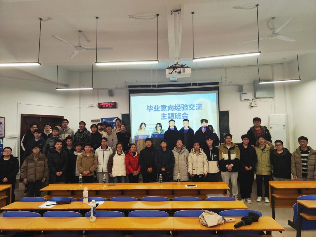 在班会的最后,同学们与盛老师及三位学长学姐合影留念,圆满完成了此次考研保研就业分享班会。通过此次班会,同学们不仅对考研、保研和就业有了更清晰的认识,还从学长学姐的经验分享中获得了宝贵的建议和指导。相信在未来的学习和工作中,22级自动化1班的同学们一定能够明确方向,勇敢前行,取得优异的成绩。
