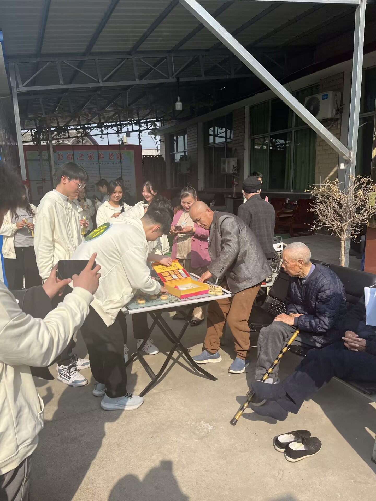 与此同时,另一部分同学围坐在老人们身边,陪他们聊天解闷。同学们耐心倾听老人们讲述过去的故事,从年轻时的奋斗经历到生活中的点滴琐事,每一个故事都饱含着岁月的沉淀。听到有趣之处,大家一起开怀大笑;说到动情时刻,同学们也不禁红了眼眶。在轻松愉快的氛围中,老人们脸上洋溢出幸福的笑容,那笑容如同春日暖阳,温暖着每一个人的心。