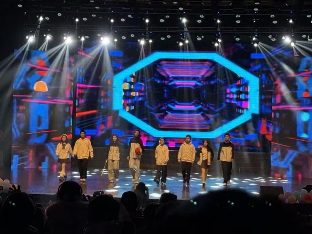各学院的同学们穿着自己班级精心设计的班服,两两一组进行时尚走秀的同时,台下同学们的欢呼与掌声也将这场潮酷走秀的气氛推向高潮!身姿挺拔的同学们踏着明快的节拍款款而来,用自信的步伐和亮眼的造型,在舞台上展现出青春活力,绽放着独属于青年的朝气与风采。