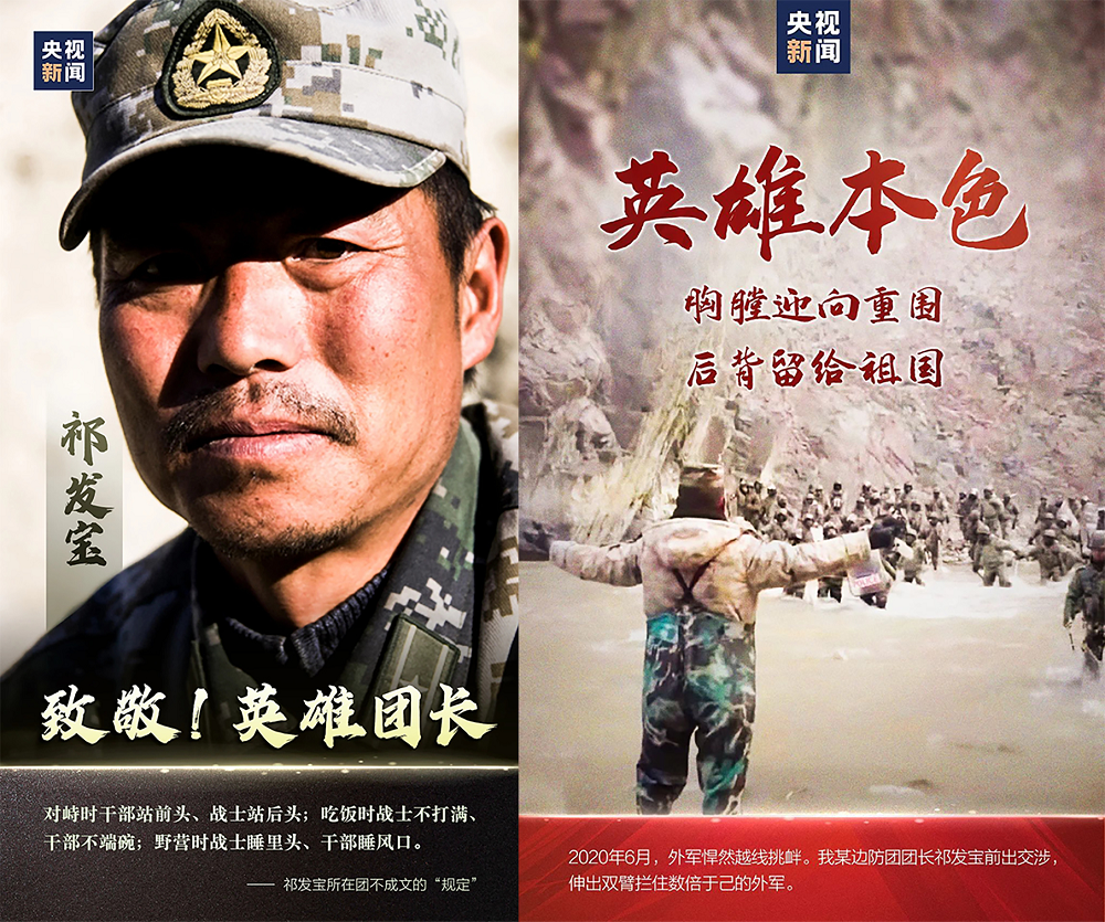 来自天南海北的一一茬茬官兵,坚守在祖国西部边陲—喀喇昆仑高原,用热血和青春筑起巍峨界碑。2020年4月以来,有关外军严重违反两国协定协议,在加勒万河谷地区抵边越线修建道路、桥梁等设施,蓄意挑起事端,试图单方面改变边境管控现状,甚至暴力攻击我前往现地交涉的官兵。面对外方的非法侵权挑衅行径,我边防官兵保持克制忍让,尽最大诚意维护两国关系大局和边境地区和平安宁。在忍无可忍的情况下,边防官兵对暴力行径予以坚决回击,祁发宝、陈红军、陈祥榕、肖思远、王焯冉等为代表的官兵英勇斗争,不惧生死,在这场边境冲突中誓死捍卫国土,最终以四死一伤取得了重大胜利,有效捍卫了国家主权和领土完整。中央军委授予祁发宝“卫国戍边英雄团长”荣誉称号,追授陈红军“卫国戍边英雄”荣誉称号,给陈祥榕、肖思远、王焯冉追记一等功。