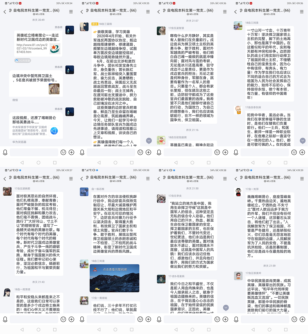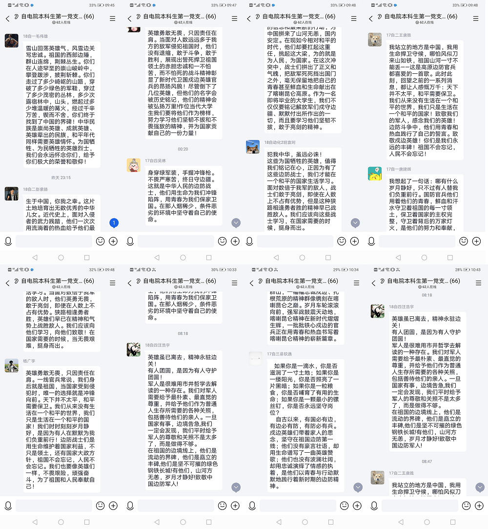 本科生第一党支部于2021年2月19日通过QQ群在线上迅速开展了“致敬英雄,学习英雄精神”主题党日活动,认真学习祁发宝、陈红军、陈祥榕、肖思远、王焯冉等官兵的英雄事迹和精神,支部全体党员深受感动,热血沸腾,在群里积极分享自己的学习心得体会。