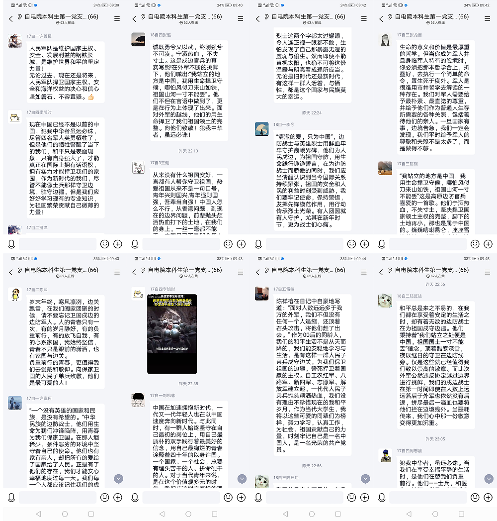2017级自动化1班的唐建辉说:“我想起了一句话:哪有什么岁月静好,只不过有人替我们负重前行。国防官兵他们用着他们的青春,鲜血和汗水守卫着祖国的每一寸领土,保卫着国家的主权完整,守卫着背后的万家灯火,是他们的努力和奉献,让我们有了和平安宁的生活。我们作为党员,要学习英雄身上爱国敬业精神,要为国家和人民敢于直面困难,甚至牺牲。我们要时刻牢记这和平的来之不易,同时也要向英雄们一样守护好这和平美丽的中国。”
