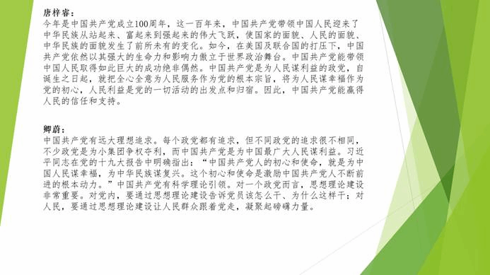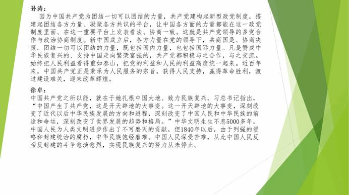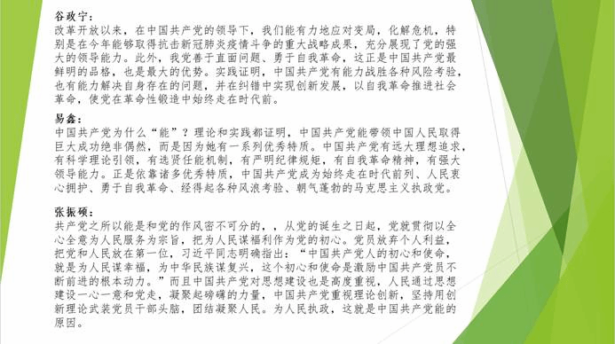 刘波同学在讨论中提到:“中国共产党的能,在于党的几大优势。科学理论指导,坚持人民立场,坚定正确道路,严明纪律规矩,勇于自我革命”。