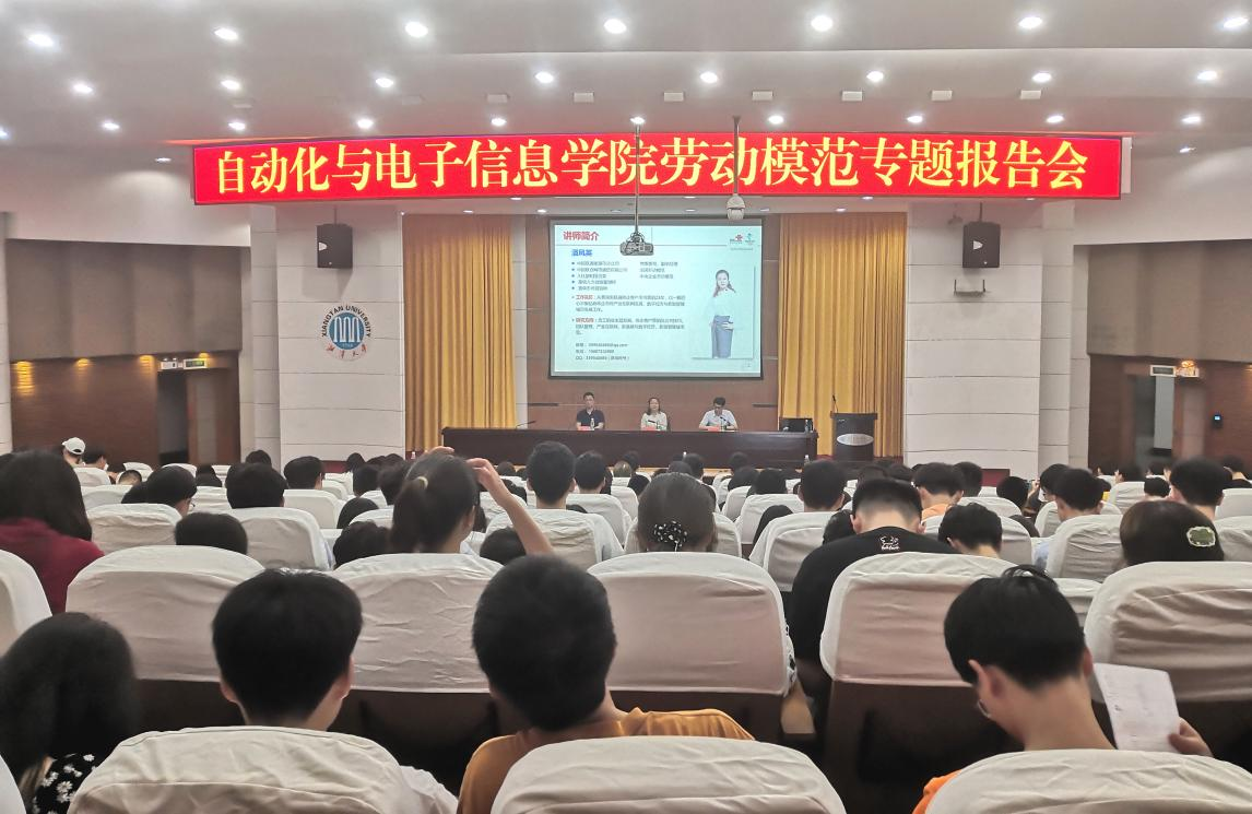 在逸夫楼一报告厅举办劳动模范专题报告会,弘扬劳模精神,推进大学生劳动教育。2019年中央企业劳动模范、中国联通有限公司湘潭分公司副总经理潘凤英女士受邀做了首场报告。