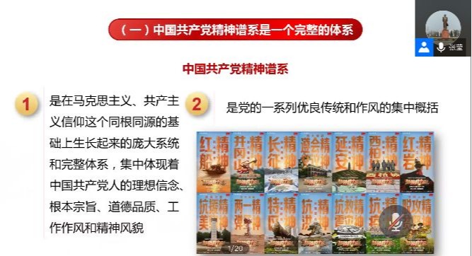张莹老师从“中国共产党人精神谱系”引入,主要从奋斗百年、建党精神、中国共产党的精神谱系、红船精神、井冈山精神、长征精神、延安精神七个方面讲述了主题内容。张老师首先带领大家回顾党的百年奋斗历程,介绍了党的伟大成就。然后通过图文讲述的方式向全体学员深刻诠释了中国共产党人的精神谱系,鼓励当代青年向老一辈革命家和共产党人学习,坚定理想信念,艰苦奋斗,敢于奉献,勇于开拓创新。在提到共产党人的初心使命时,张老师表示:“入党誓词并不多,记住并不难,难的是终身坚守。”