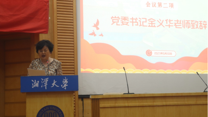 在奏唱国歌之后,党委书记金义华老师为大会致辞。她表达了对团委·学生会的充分认可、殷切期待和诸多嘱托,也提出几点希望:一是希望各位青年不忘初心,牢记使命;二是希望各位青年不断学习,与时俱进;三是希望各位青年脚踏实地,奋勇争先。她回顾了初到h韩漫