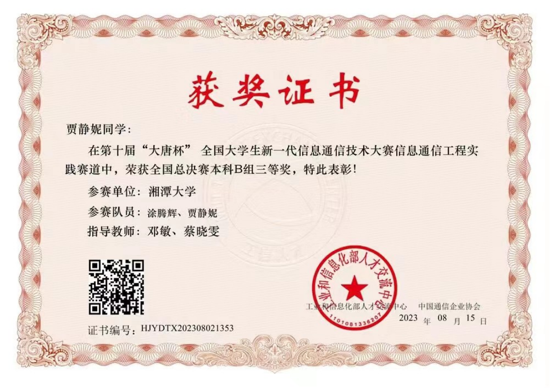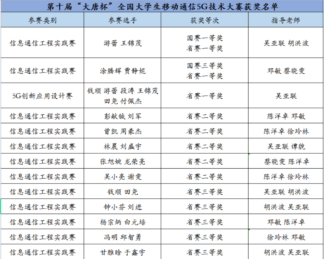 承担了大唐杯赛校内参赛的组织和培训工作,配合大赛组织方完成了宣讲、报名、省级赛训练、省赛组织、全国总决赛训练等工作。全校多个学院的学生共32支队伍报名参赛,其中3支队伍获得省级一等奖,5支队伍获得省级二等奖,5支队伍获得省级三等奖,2支队伍进入实践赛道全国总决赛。