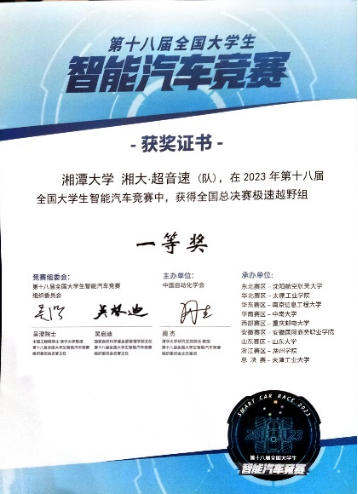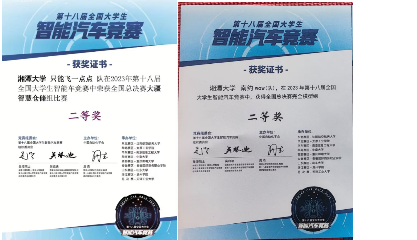 其中,湘大·超音速队(指导老师:向礼丹、郭雪峰)继去年室外专项赛取得国赛一等奖后,再次在室内竞速赛中取得突破,斩获国家一等奖。“南约WOW”队获得完全模型组全国二等奖,“流星雨”队获得声音信标组全国二等奖,“电用不完”队获得声音信标组全国二等奖,“只能飞一点点”队获得大疆智慧仓储组全国二等奖。