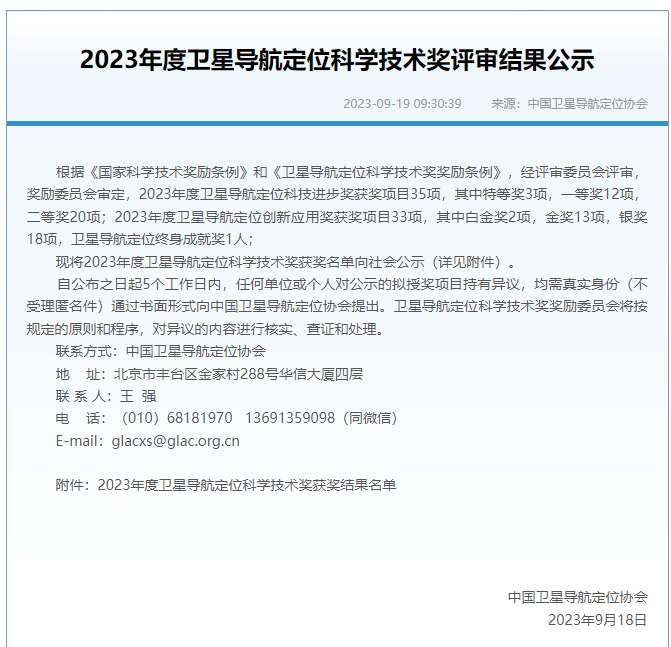2023年度卫星导航定位科学技术奖获奖结果名单截图