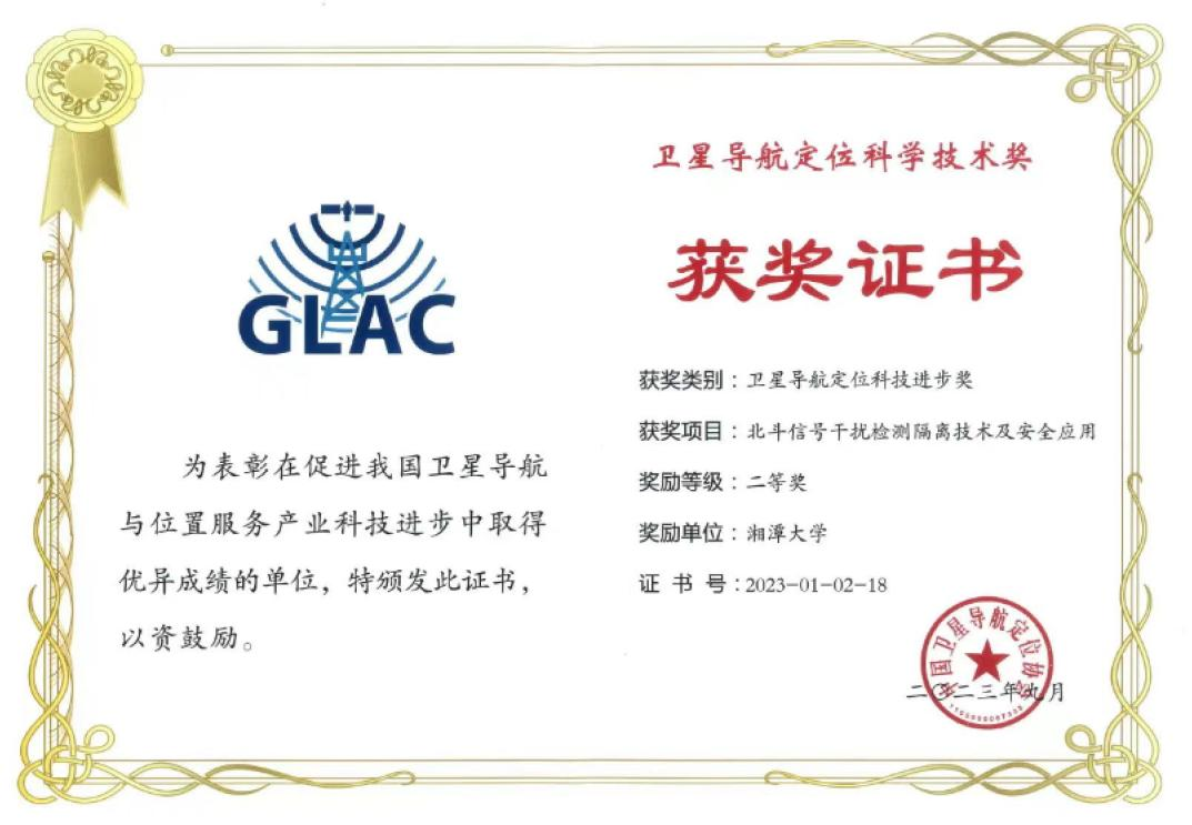 和辽宁天衡智通防务科技有限公司联合申报的“北斗信号干扰检测隔离技术及安全应用”项目荣获2023年度中国卫星导航定位科技进步奖二等奖,“智能可信导航与定位”湖南省重点实验室团队的姚志强教授、邓敏讲师、陈洋卓讲师、盛孟刚副教授、蔡晓雯副教授等为项目主要完成人。