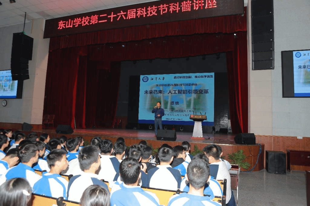人工智能湖南省科普基地负责人、人工智能系谭貌教授应邀前往湘乡市东山学校,参加该校举办的第二十六届科技节活动。谭貌教授为学校高一和高二年级1000余名同学带来了题为“未来已来:人工智能引领变革”的精彩科普讲座。