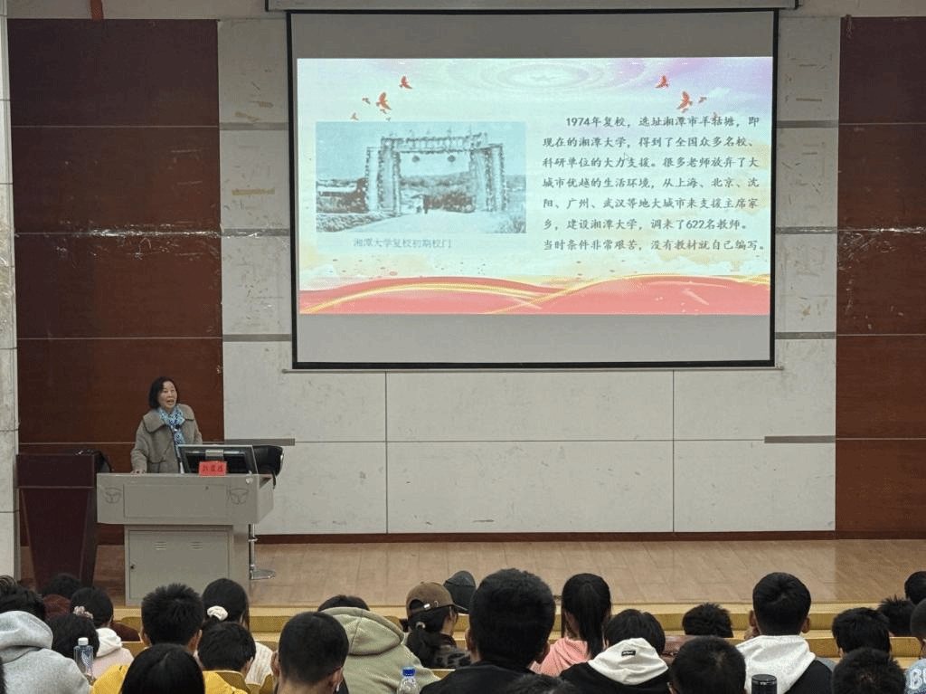 关工委于12月3日在逸夫楼第二报告厅组织开展以“传承湘大红色基因,铸造母校学子辉煌”爱国荣校主题公开课。学院关工委副主任彭爱莲担任主讲嘉宾进行授课,学院党委副书记、关工委主任郭凤安,辅导员熊峰出席,2024级自动化专业与人工智能专业全体学生参加了此次活动。
