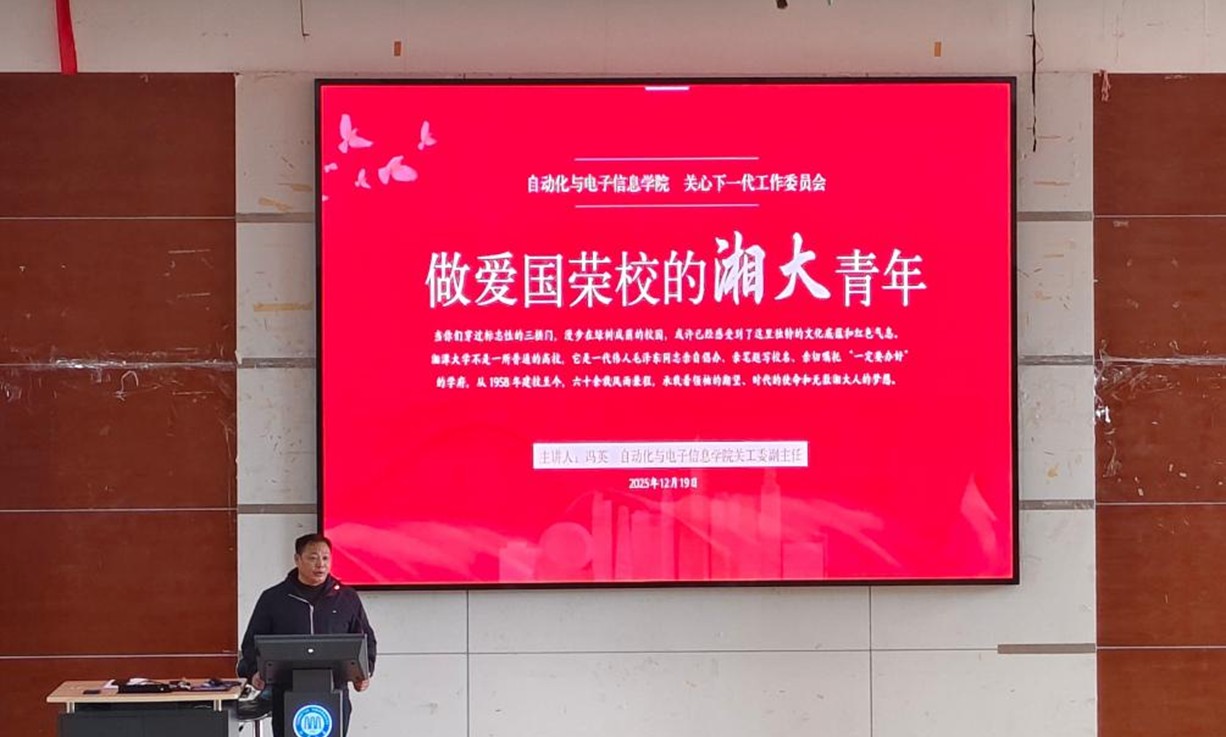 关工委在逸夫楼第二报告厅举办一场别开生面的爱国荣校教育主题公开课——“做爱国荣校的湘大青年”,学院关工委副主任冯英担任主讲人,学院党委副书记郭凤安、辅导员熊峰与2025级自动化及人工智能专业全体学生共同参与,旨在厚植青年大学生爱国荣校情怀。